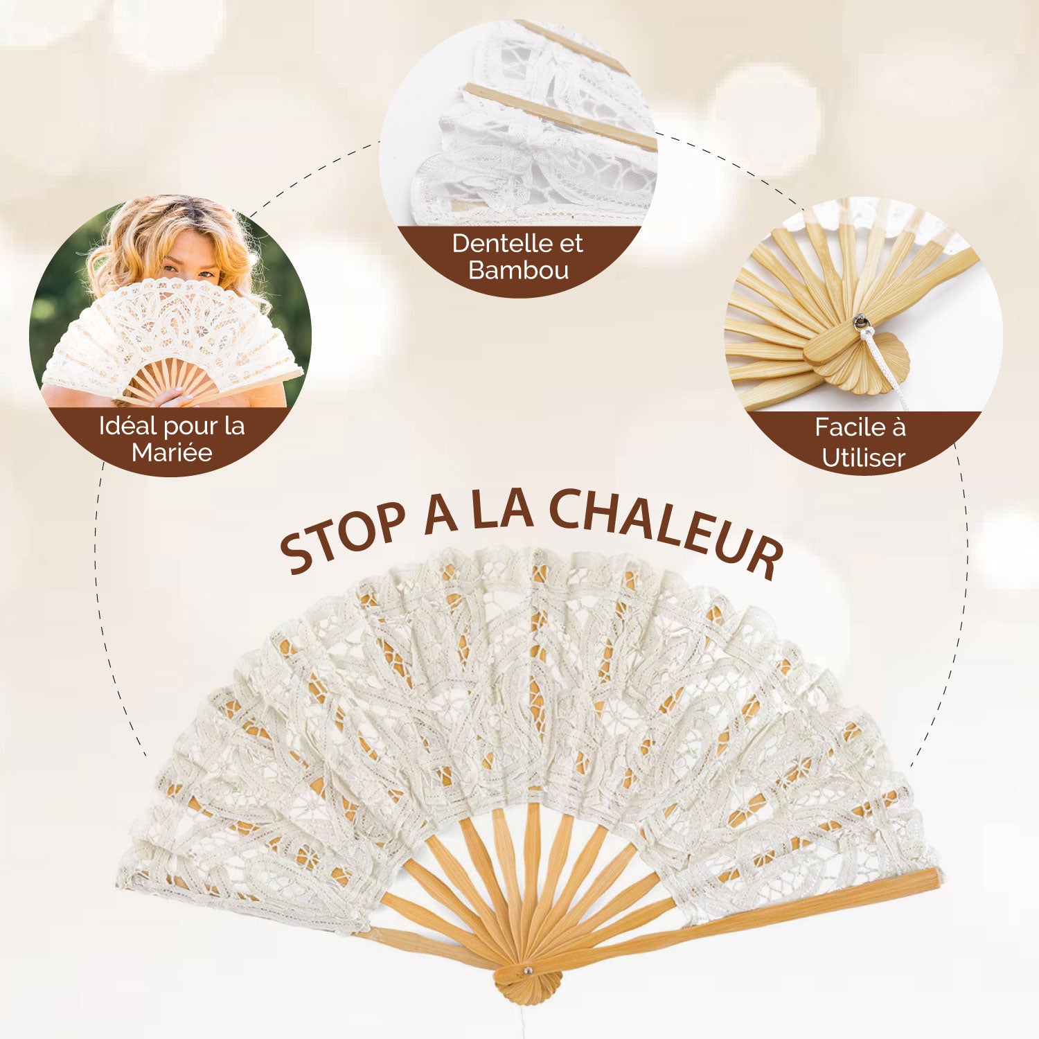 Avec ses grandes dimensions (50 cm de largeur et 27 cm de hauteur), cet éventail offre une excellente ventilation tout en créant un effet visuel remarquable, parfait pour sublimer les photos de mariage. Son style intemporel s’accorde parfaitement avec les robes de mariée bohèmes, champêtres ou classiques.